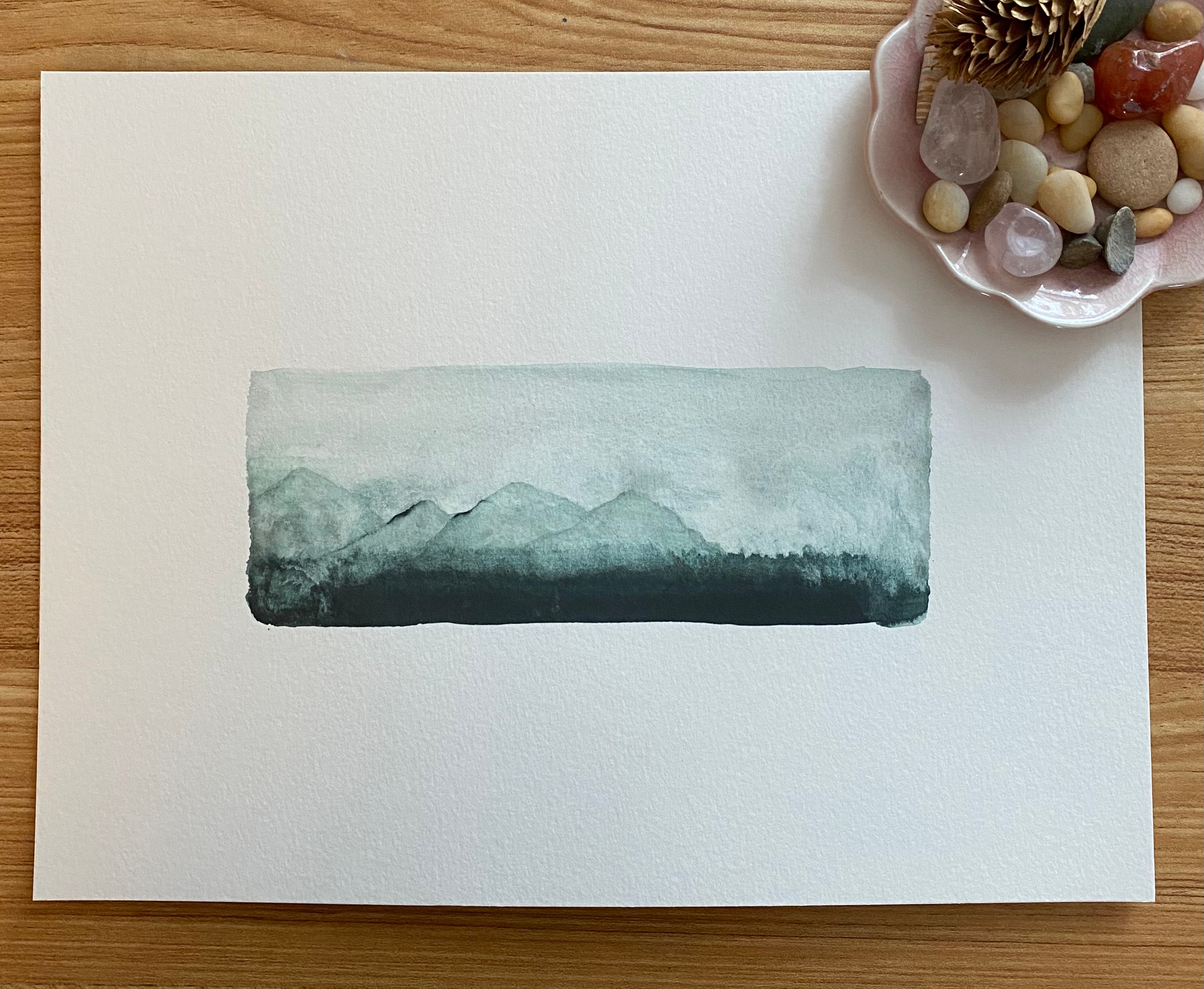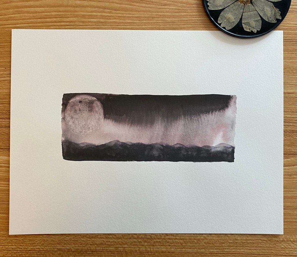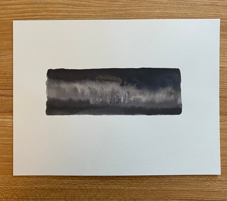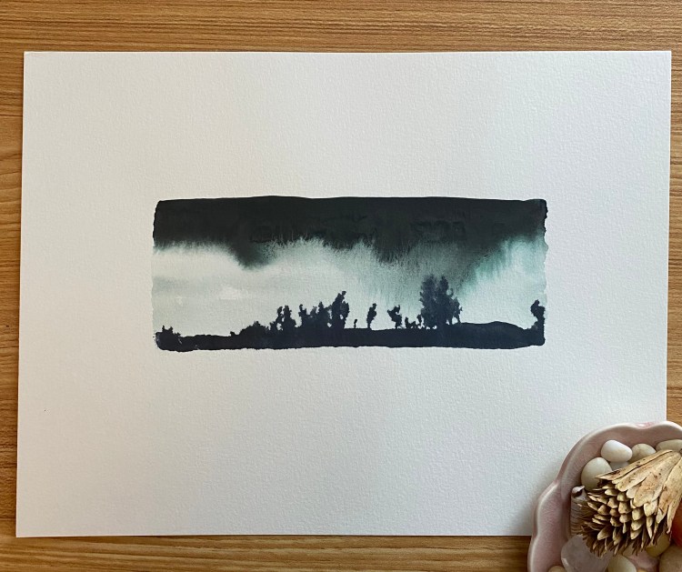 These little nature-inspired paintings were born from curiosity and experimentation with watercolors. I love not knowing exactly what will happen when the water and color hit the page. The process is a kind of meditation, of being in the moment without any expectations. But, once an image emerges, I’m a little more intentional with the shapes and lines, using smaller brushes or other tools to define or mute the colors. I also think about each landscape as if someone is looking through binoculars, so I keep each about the same size and shape. The edges are rough, resisting perfection like the landscape itself. The result is a painting that resembles a place you’ve been, a place you’ve seen in a magazine or photo, or a place you’ve dreamed of.